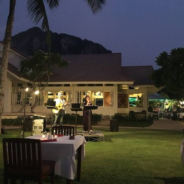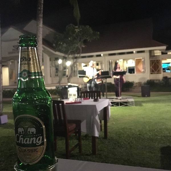 我们一样点了大虾、鸡汤、青菜、烧烤串串什么的,埋单才800B,我还给老板和厨师试了一下广东的五叶神,看着他们皱着眉头说“very good”真的好搞笑。餐桌在草地上,烛光晚餐,台上有歌手唱歌,右边就是海边,吹着海风位置就在奥南海滩尽头的小路里,一大片草地上几张餐桌,很容易找。