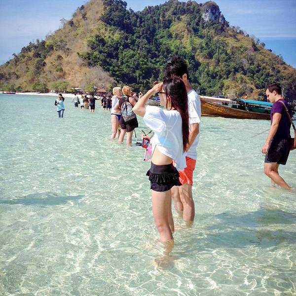 岛上的游客们会在这里等待退潮,那时三岛之间慢慢会显露出细长的白色沙滩路,可以踩着白色沙滩行走三个岛屿之间。踏在细软的白沙上,海浪会轻轻的打在你的脚上,有种“海中漫步”的乐趣。海水退潮后,原本湿润的沙地变得蓬松像海绵一样,游客会铺上毛巾,躺在松软的白色沙滩上享受大自然的天然床铺。