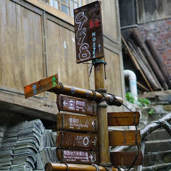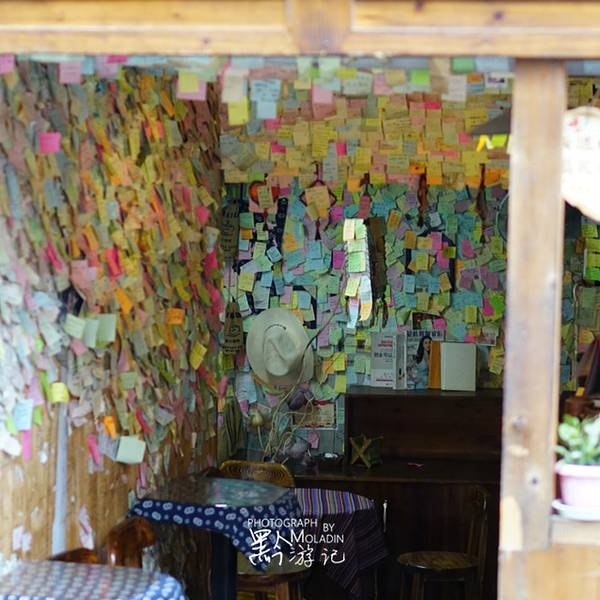 想去最高的观景台看看,所以一路向高处走去,雨中看看这些竹子木头建造的房屋也是别有一番趣味,路标也是在众多同质化的小清新里难得的出彩的小清新,还遇到一家酸奶店,里面满满的便签似乎也在告诉路人自己店里的酸奶是有故事的酸奶,可惜这种便签套路在各地都见的多了,所以一声呵呵,看一眼离去了。