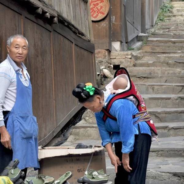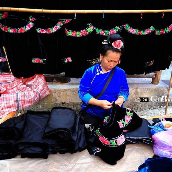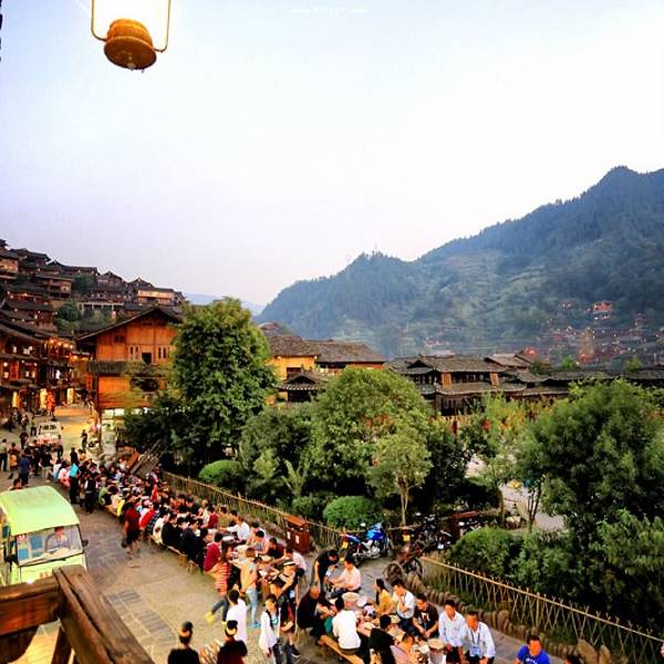 2、到了观光车的终点站,进去要徒步经过一段距离的古街,在古街上可以看到许多本地苗族的阿婆和苗族的姑娘,服饰非常的好看,西江苗寨是国内最大的苗寨群,由7,8个苗寨组成,晚上这里是一个不夜城,真的是万家灯火,整个西江的夜景非常的美。