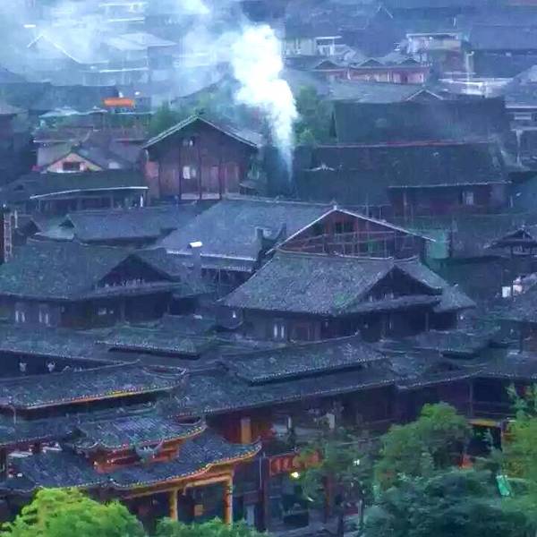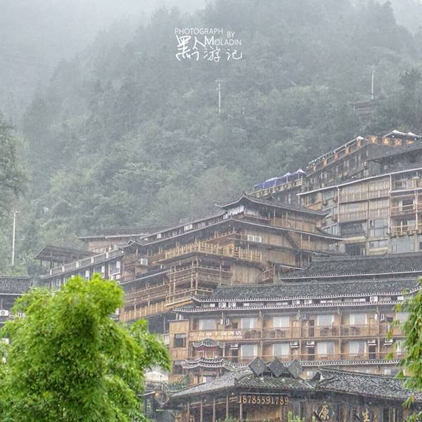 整个苗寨的制高点是观景台,站在观景台上往前一望,远处山腰上才是真正的苗寨,苗寨还是那种古朴的风格,那是真正的苗族人自己的住处,山下仿苗寨风格商业区的建筑完全没法相提并论。虽然当天一直在下雨,但是也托了一场绵绵细雨的福,仙气缭绕什么的我也说的太多了,直接看图吧,就是那么好看。