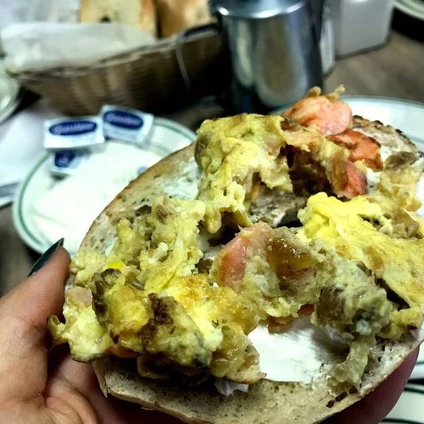 地址:541 Amsterdam Ave 品尝地道的Bagel也是体验纽约美食生活必不可少的一环。Bagel可以直译为贝果或者百吉饼,是起源于17世纪的 波兰 ,在1880年左右,随着大批 东欧 的犹太人逃难涌入 美国 ,bagel的做法也传入了 美国 。bagel的做法属于低脂肪、低胆固醇、低发酵,深受 纽约 人的喜爱,将切成两半的圆圈bagel中间加上奶酪片、烟熏三文鱼、洋葱、鸡蛋、蔬菜等配料,做成bagel三明治。曼哈顿有很多很有名的专门做bagel的店,像H&H Bagel这样的连锁店。我选择的是比较传统的老牌的百年老店,这家店建于1908年,很多电影(像《革命之路》《心灵钥匙》等) 和美 剧(《Law & Order》)都曾在这里取景过,橱窗玻璃展示着拍摄的照片和一些奖项。一进门感觉有点像那种Deli的熟食店,卖各种面包和各种各样的海鲜制品,不要被吓到,左转有个小门,进去才是可以坐着吃早餐的地方。地方并不大,也就十来张很小的桌子密密麻麻摆放在,每桌几乎背靠背坐着,生意很火爆。这里点餐也需要技巧,光bagel胚子的选择就有很多,也可以选直接搭配好的bagel 三明 治,或者直接点bagel和配料,自己来抹奶酪或黄油,加配料的。 这个是bagel三明治,黑黑的颜色并不是巧克力,而是南瓜的。配的烟熏三文鱼、西红柿、洋葱和白奶酪,搭在一起居然味道很惊艳,一点也没有腥味,鱼肉的鲜嫩配上嚼起来很有韧劲的bagel,口感很赞。需要自己搭配的三文鱼炒蛋味道也很赞,挖一大勺浓浓的白奶酪抹在bagel上,撒一点点椒盐,铺上厚厚一层三文鱼炒蛋,咬一口不要太满足。再来一杯浓浓的咖啡或是热巧,开启美好的一天。这里的坐标离 美国 历史自然博物馆很近,走路大概十来分钟,吃完刚好溜达过去参观。