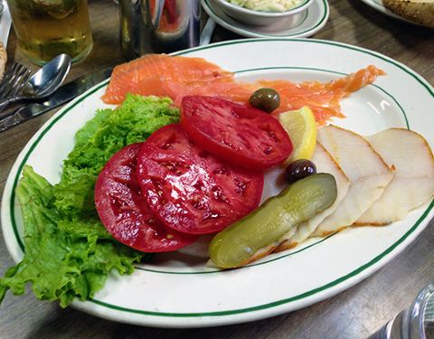 到了纽约怎么能不吃bagel,这家门面不大,装修温馨,分里外两间,外面主要是卖饮料和腌鱼、肉和奶酪等,里间是餐厅,不大,挤了好几张桌子,去的时候人很多,只剩下靠门口的一张小桌子,点了一份三文鱼和银鳕鱼拼盘,再加上地道的犹太bagel,配上厚厚的奶油,自制的腌黄瓜,非常独特的一顿午饭,来纽约的你一定要来尝尝