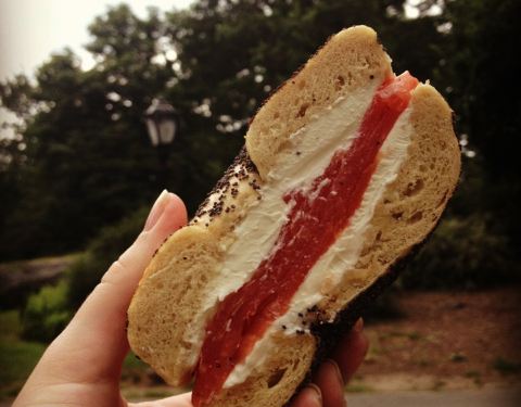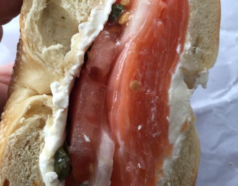 品尝地道的Bagel也是体验纽约美食生活必不可少的一环。Bagel可以直译为贝果或者百吉饼,是起源于17世纪的 波兰 ,在1880年左右,随着大批 东欧 的犹太人逃难涌入 美国 ,bagel的做法也传入了 美国 。bagel的做法属于低脂肪、低胆固醇、低发酵,深受 纽约 人的喜爱,将切成两半的圆圈bagel中间加上奶酪片、烟熏三文鱼、洋葱、鸡蛋、蔬菜等配料,做成bagel三明治。曼哈顿有很多很有名的专门做bagel的店,像H&H Bagel这样的连锁店。我选择的是比较传统的老牌的百年老店,这家店建于1908年,很多电影(像《革命之路》《心灵钥匙》等) 和美 剧(《Law & Order》)都曾在这里取景过,橱窗玻璃展示着拍摄的照片和一些奖项。一进门感觉有点像那种Deli的熟食店,卖各种面包和各种各样的海鲜制品,不要被吓到,左转有个小门,进去才是可以坐着吃早餐的地方。地方并不大,也就十来张很小的桌子密密麻麻摆放在,每桌几乎背靠背坐着,生意很火爆。这里点餐也需要技巧,光bagel胚子的选择就有很多,也可以选直接搭配好的bagel 三明 治,或者直接点bagel和配料,自己来抹奶酪或黄油,加配料的。