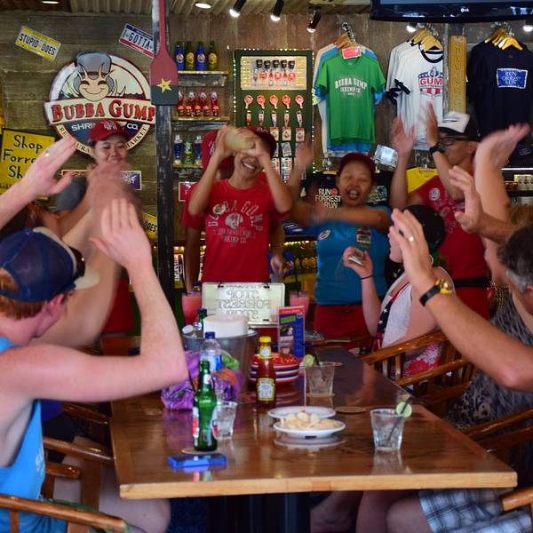 Bubba Gump Shrimp Co,对,就是《阿甘正传》(Forest Gump)中阿甘所经营、以他的好友Bubba Blue 命名的餐厅。餐厅坐落于热闹的景点之一渔人码头。一走进餐厅,各处装饰都是以电影为灵感,墙上挂着人物的戏服和海报,招呼服务员的方式也用到剧中的马拉松梗——桌上有两个车牌,不需要服务员的时候,让牌子停留在 "Run Forest Run",若需要服务,则把牌子翻到 "Stop Forest Stop" 即可。至于其余各种“彩蛋”,还要你自己来体会和发掘了。阿甘在电影里曾以捕虾创业,所以菜单里必不可少的是各种做法的虾,简直让人惊叹一种食材可以如此千变万化。你怕吃不过来?没事,试试虾之天堂(Shrimper's Heaven,22.49 美元 / 份), 四种不同做法的鲜虾一起上桌,是不容错过的开胃小菜。另一道推荐主菜是蒸海鲜(Steamed Shellfish,时令价),螃蟹、虾、蛤蜊和蚌在黄油与特制香料中慢煮,吃完海味,再用汤汁就着洒上香葱的米饭,着实是完美的一餐。Bubba Gump 是由知名连锁餐饮集团 Landry's, Inc. 开发,在美国他处也有旗舰店。同公司旗下还有不少有趣的主题餐厅,同在渔人码头的还有以蟹料理出名的蟹居(The Crab House)和热带雨林主题热带雨林咖啡(Rainforest Café)。若没机会在 Rainforest Café 用餐,我们还是推荐你走进去瞧一瞧,不时会突然动一下的机器动物、迷你水族馆、室内瀑布、模拟星空以及每半小时一次的“热带大雨”,都会带给你新奇而激动的体验。