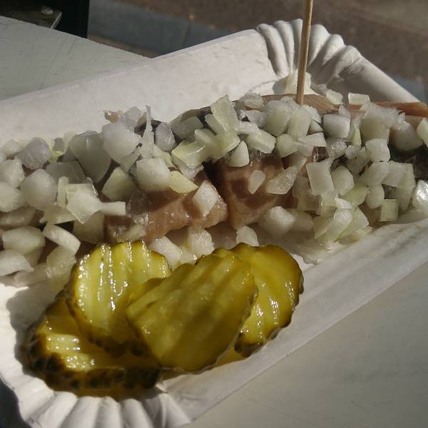 Frens Herring 已经有近30 年历史,在阿姆斯特丹是最著名的一家。生鲱鱼最经典的食法必属头扬45 度,嘴巴大大张开,手高举拎住尾部,把整尾生鱼送进嘴里。如果是初食者,建议先将鲱鱼切成小块,再搭配洋葱和酸黄瓜来食用。