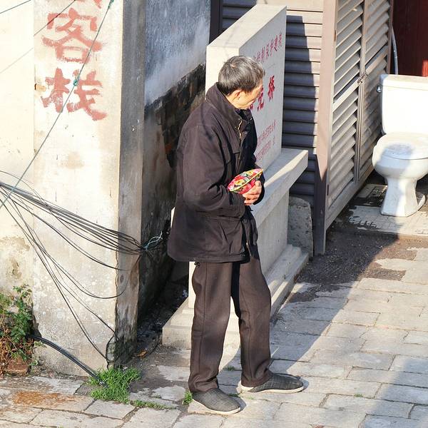 点心店对面的林家铺子正在做袜底酥,昨天在古镇就看到很多店在卖,阿姨在做我就停下脚步看看,先小心在机器山铺一层袜底酥,然后盖上焖一会,开盖子给袜底酥翻身,隔着几米就能闻到香味了。出锅赶紧买一份尝尝,新出炉的袜底酥热乎乎的,咬上一口酥酥脆脆,上面刷的油香而不腻,叫袜底酥是因为宋孝宗出游时将它误认为是袜底,据说这家店的酒酿饼也很好吃,但是可能由于太早了没得卖。早起的老奶奶刚从集市回来,拎着两小袋东西,大叔抱着热水袋在河边晒着太阳,冬季暖暖的早晨