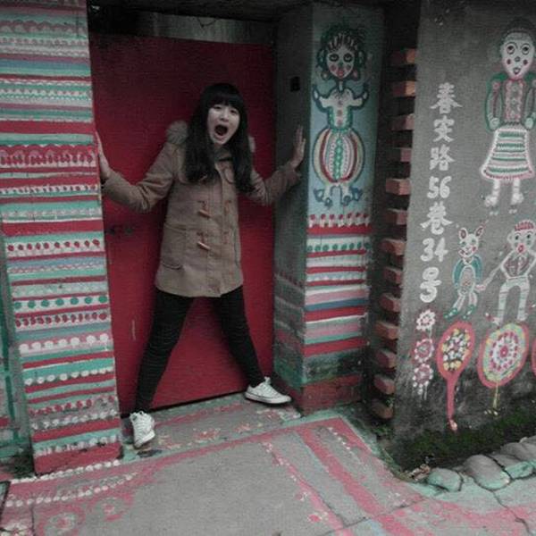 欣赏眷村内地面、墙壁上各种色彩艳丽的画作,拍下照片留作纪念。
