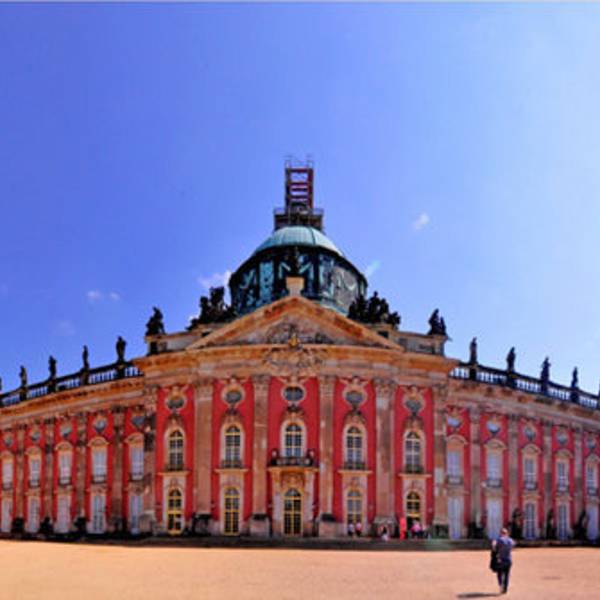 新宫(Neues Palais)建筑群是普罗士国王兴建的最后也是最为壮观的巴洛克式遗址。该宫殿建造的部分原因是为了回应法国国王兴建的凡尔赛宫,用以自夸。新宫 (Neues Palais) 建于1763 至1769 年,全长近 700 英尺,这座三层建筑上方装饰着雄伟的穹顶,雕刻有 428 座大型雕塑。新宫由 200 间房屋、宽敞的住宿区域和用于皇家职能的代表性房间组成,殿内还有全部采用海贝和半宝石装饰的石窟大厅,大理石厅和小型剧院。