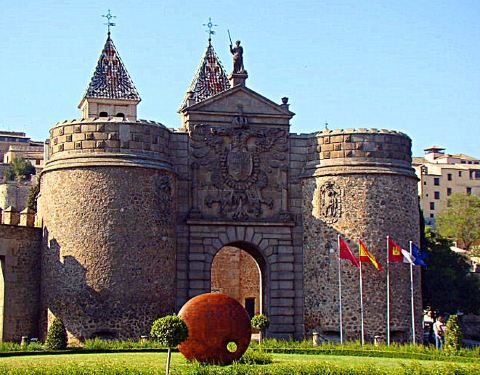 比萨格拉门。 托莱多 西班牙 比萨格拉门: 托莱多的古城有城墙围着,这座城门便是进出托莱多古城的唯一大门。 比萨格拉门建于16世纪中叶,门上正中心刻着当时欧洲最强大的国王——西班牙国王卡洛斯一世的王徽,这在开瓶器上依稀尚能见到。