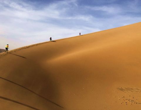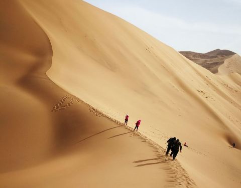 1、 在沙漠中徒步,一定要穿长衣长裤,最好是冲锋衣裤或速干衣裤,鞋子以高帮徒步鞋为宜。