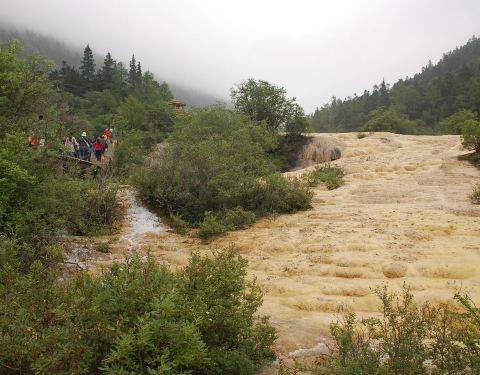 到了金沙铺地了, 由于碳酸盐在这里失去了凝埂成池的地理条件,因此漫坡的水浪,在一条长约1到了金沙铺地了, 由于碳酸盐在这里失去了凝埂成池的地理条件,因此漫坡的水浪,在一条长约1.3米的脊状斜坡地上翻飞,并在水底凝结起层层金黄色钙华滩,好似片片“鳞甲”,在阳光照耀下发出闪闪金光,是黄龙又一...到了金沙铺地了, 由于碳酸盐在这里失去了凝埂成池的地理条件,因此漫坡的水浪,在一条长约1.3米的脊状斜坡地上翻飞,并在水底凝结起层层金黄色钙华滩,好似片片“鳞甲”,在阳光照耀下发出闪闪金光,是黄龙又一罕见奇观。 展开