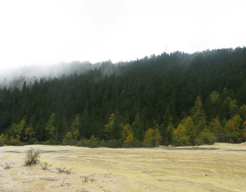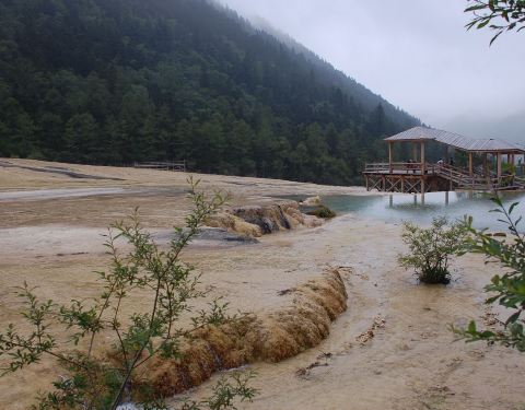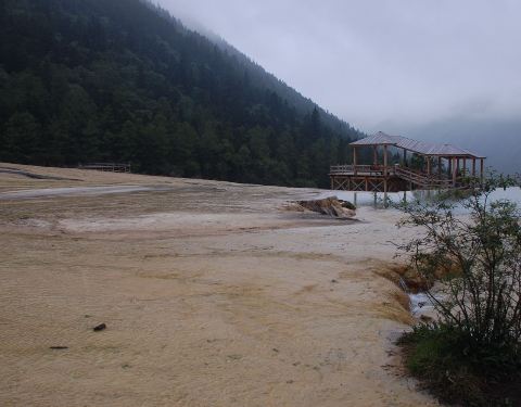 金沙铺地在黄龙风景名胜区的中段半山腰上,是一段比较长的金黄色的钙化沉积岩坡地,并且每年仍在缓缓地增长金沙铺地在黄龙风景名胜区的中段半山腰上,是一段比较长的金黄色的钙化沉积岩坡地,并且每年仍在缓缓地增长,旁边有游步道和观景平台。