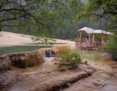 在河床上形成了一道百多米宽,数公里长的黄色华盖带,从高空俯瞰,犹如黄龙出海,这就是黄龙景区名字的由来历经千万年的钙化水流冲刷,在河床上形成了一道百多米宽,数公里长的黄色华盖带,从高空俯瞰,犹如黄龙出海,这就是黄龙景区名字的由来。