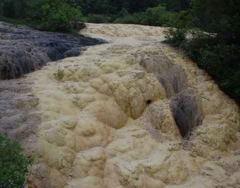 山上流下的融水带有很多钙质,历经亿万年沉淀形成了这条黄色华钙地貌带,空中俯瞰犹如黄龙出海,故此...位于景区中部,是一处典型的喀斯特地貌,山上流下的融水带有很多钙质,历经亿万年沉淀形成了这条黄色华钙地貌带,空中俯瞰犹如黄龙出海,故此得名“黄龙沟”。