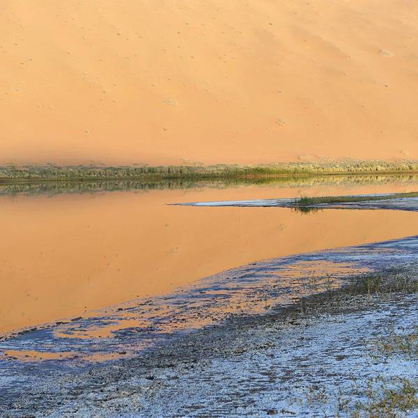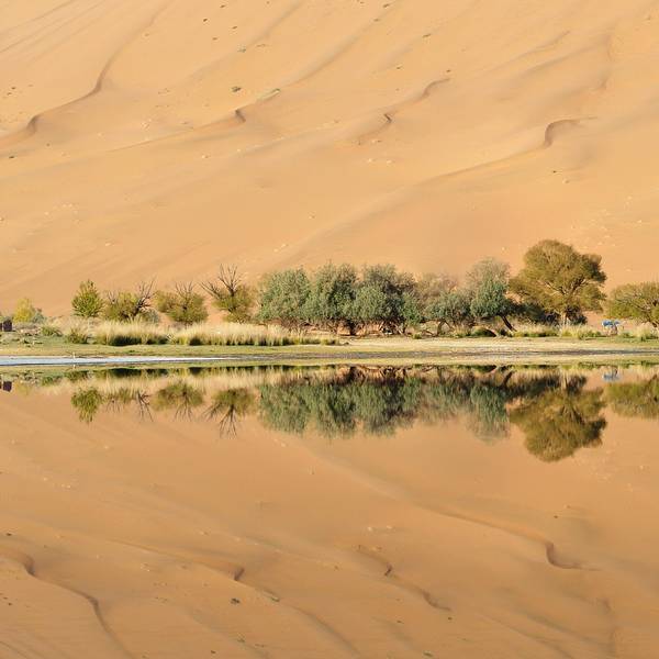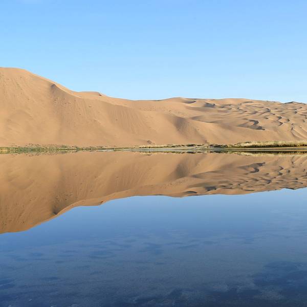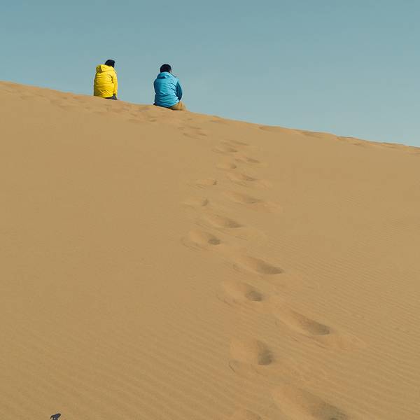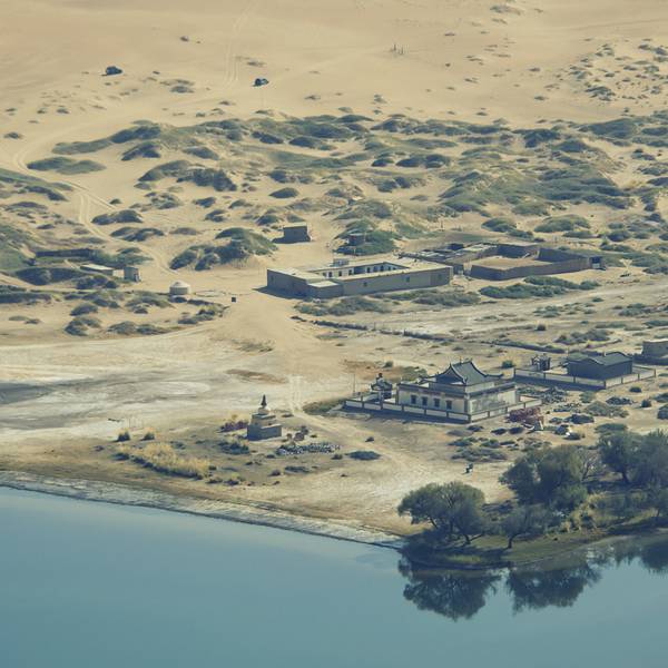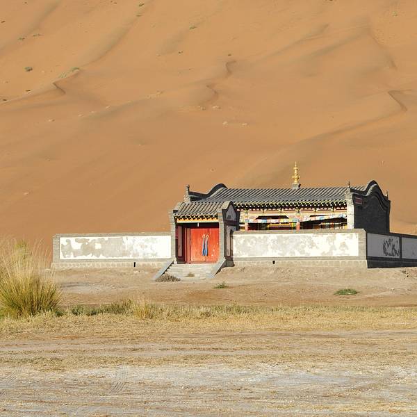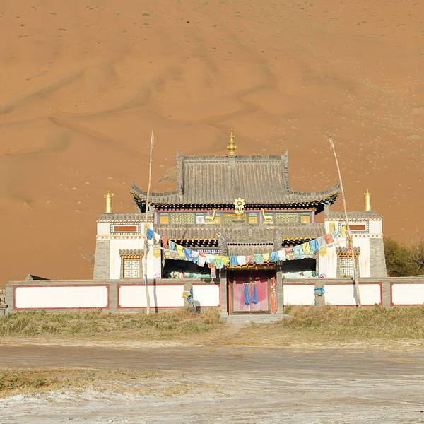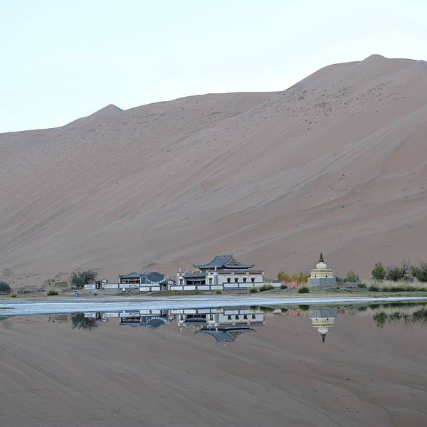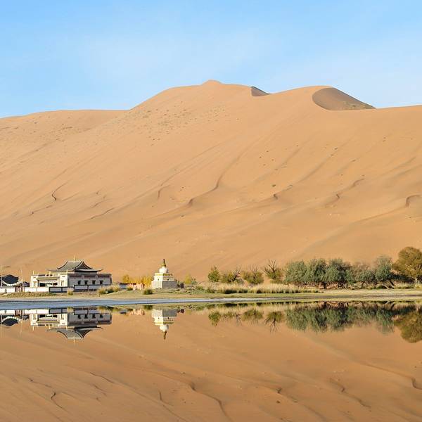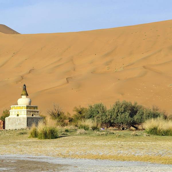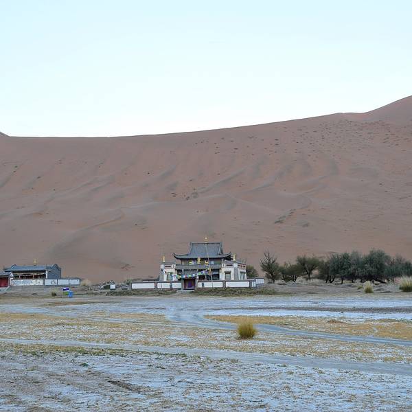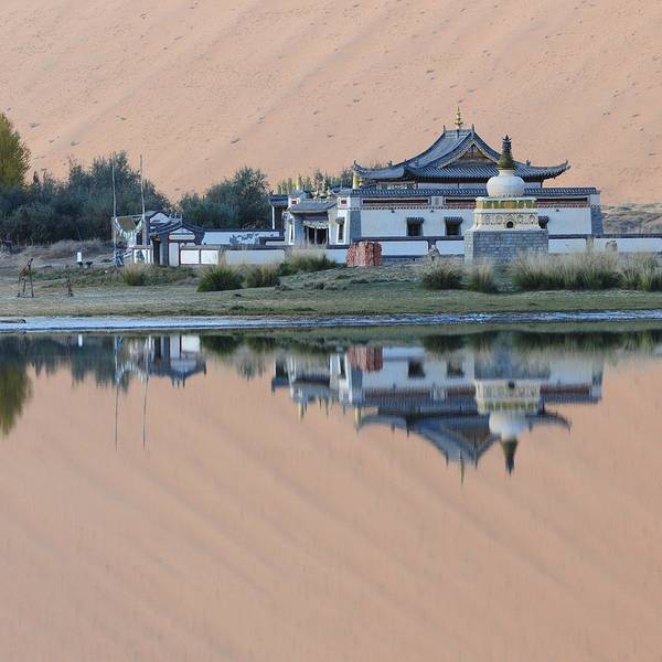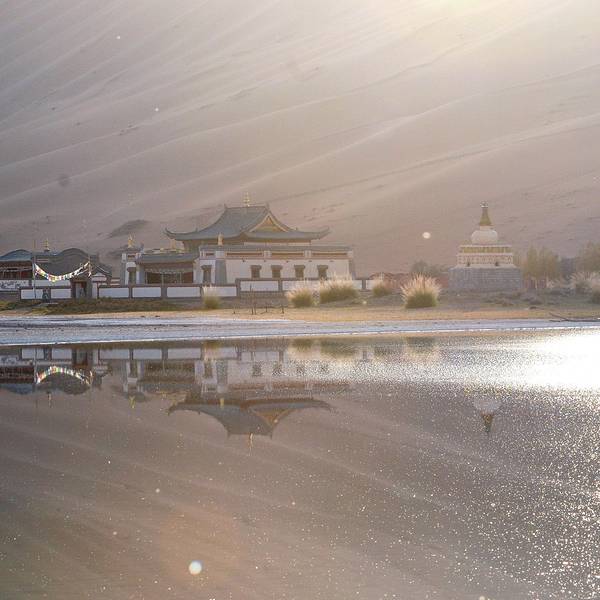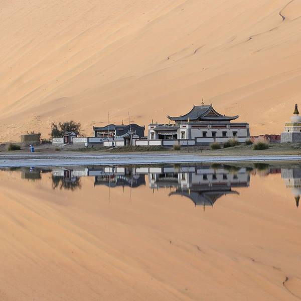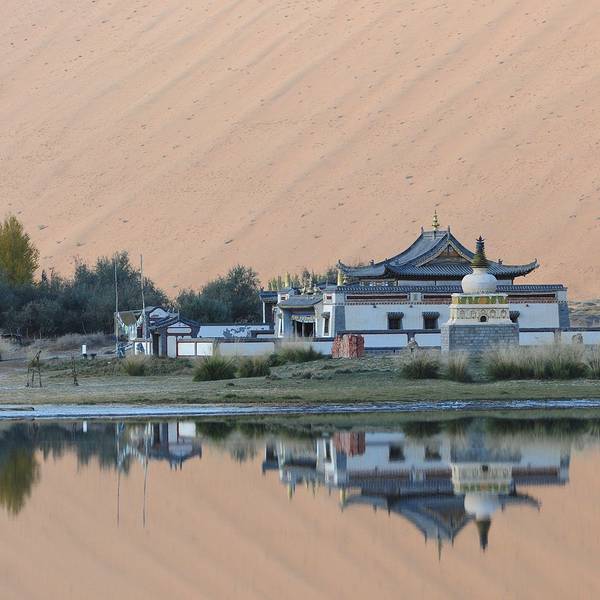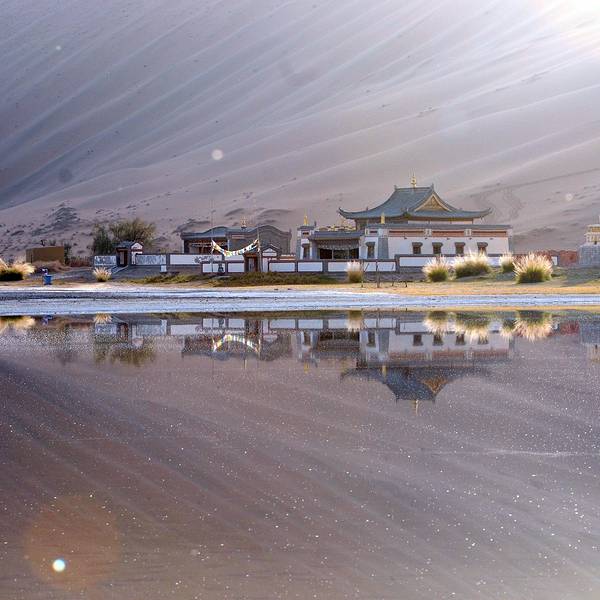 苏敏吉林东沙峰,为旭日东升之时整个巴丹吉林沙漠中享受第一缕阳光的地方,因此有了一个美丽的名字“娜仁肖润”,意为“太阳峰”;而与之相辉映的西沙峰,俯瞰如圆月,远观如弯月,得名“萨仁都贵”,意为“月亮弯”,两峰似取日月精华,孕育了佛家胜地苏敏吉林。