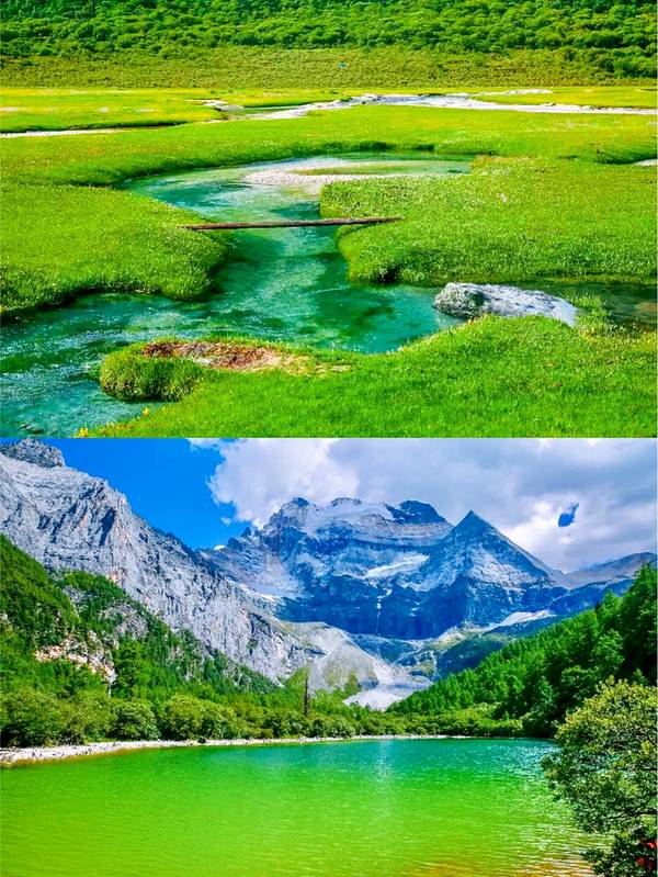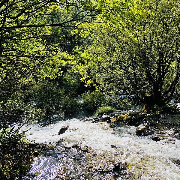 此段路程7公里,可以乘坐电瓶车走水泥路,也可以徒步走木栈道,均沿河而上。我推荐大家走水泥路,乘坐冲古寺-洛绒牛场的电瓶车,往返80元/人,20分钟就可以到达。从牛场到牛奶海,7公里左右,路况如下:刚开始1/6的路程是在牛场的边缘沿着河逆流而上的平路,很多小草,走上去软软的很舒服;中间2/3路程为上坡,其中有一段必须自己爬上去,很陡峭,还要涉水,但沿途风景很棒;最后的1/6是平路,慢慢的就走到牛奶海了。【牛奶海-五色海】
