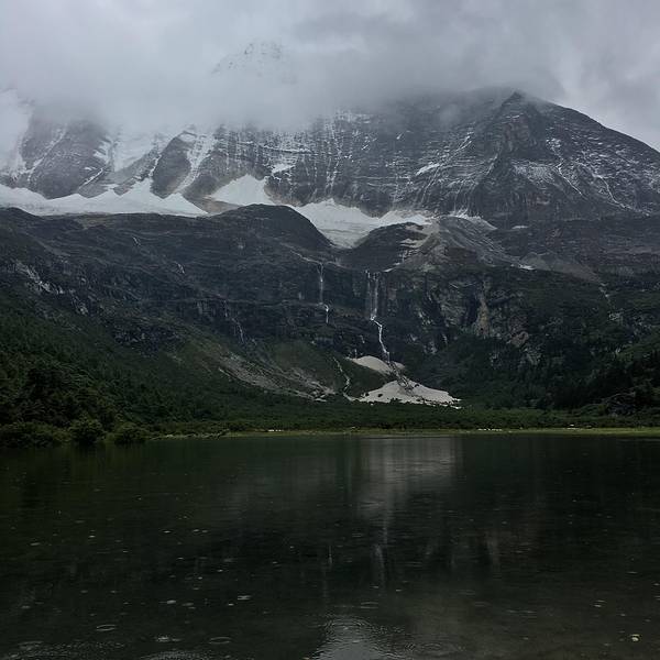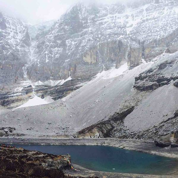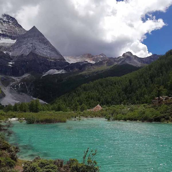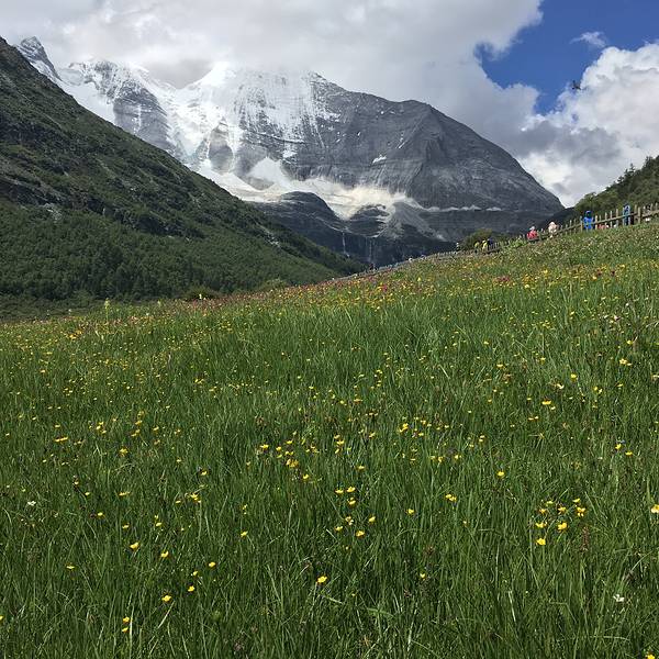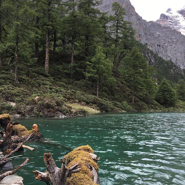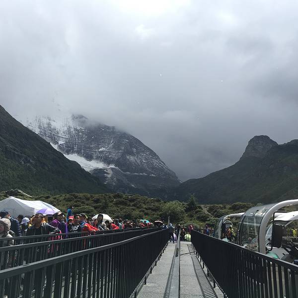 因为前一天赶路很累,第二天早晨7点才出门,吃完早餐拼了路边5元一位的车到达游客中心,此时,游客已经很多了,只好排队买票,后来发现别人都在网上预定,然后拿身份证去窗口直接取票,这样快一些,我们便也这样买了票,PS所以建议大家提前网上预定门票。买完票后需坐大巴上山,排队坐大巴因人多花费了近1个小时的时间,随后又是一个小时的车程到达冲古寺,这才是上山初始地点。因为到达冲古寺已经11点多了,为了节省时间,我们没有选择走路上去,而是坐电瓶车上去的,车费80元,目的地在洛绒牛场附近。夏季的洛绒牛场是真的漂亮,翠绿的草甸上开满了五颜六色的野花,和远处的央迈勇遥相呼应,构成极致美景,《从你的全世界路过》就是在这个地方取的景。从洛绒牛场往上走就能到达牛奶海、五色海了,你可以走路上去,快的话2小时,也可以选择骑马上去,费用500元左右。我们是走路上去的,路上都是马粪,第一次知道原来马粪那么臭,越往上路越不好走,走了2个多小时,终于达到牛奶海,第一眼有点失望,没有网上图片那种颜色,在湖边逛了逛,不一会儿,天气开始阴沉下来,随后下起了小雨,又一会儿变成冰雹,而且下的越来越大,没办法我们只能下山去,也错过了旁边的五色海。不过天气不好的好处是,最后我们看见了牛奶海的真面目,水的颜色像蓝宝石一样,漂亮极了。