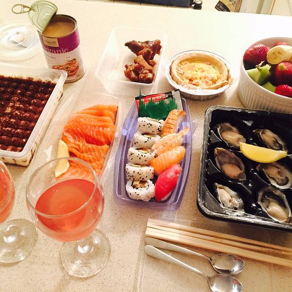 左手边的提拉米苏超级大!鲍鱼和三文鱼很新鲜~ 总之自己做比在外面吃一顿便宜很多~我吃了三天