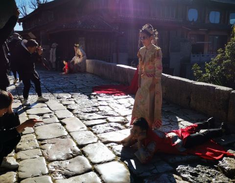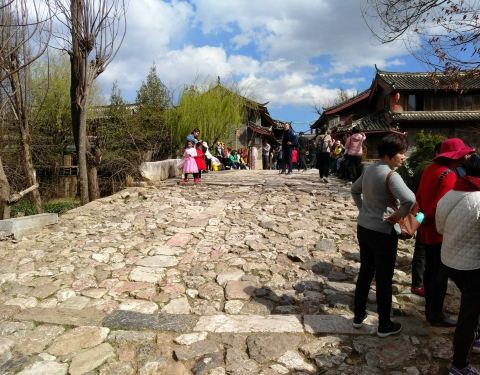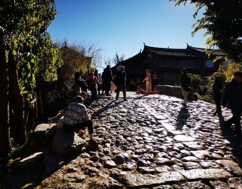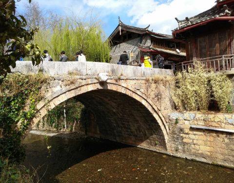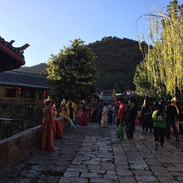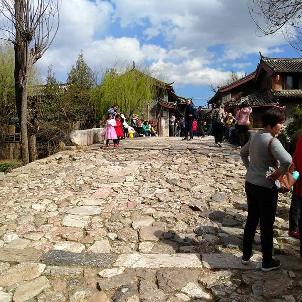 有几百年历史建于明朝的青龙桥,不长大约五六米,全部都是大石块磊成,丽江古城最出名的古桥,束河八景之一有几百年历史建于明朝的青龙桥,不长大约五六米,全部都是大石块磊成,丽江古城最出名的古桥,束河八景之一,正对聚宝山,所以有很多游客在拍婚纱照。