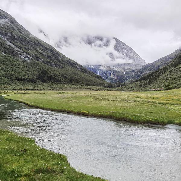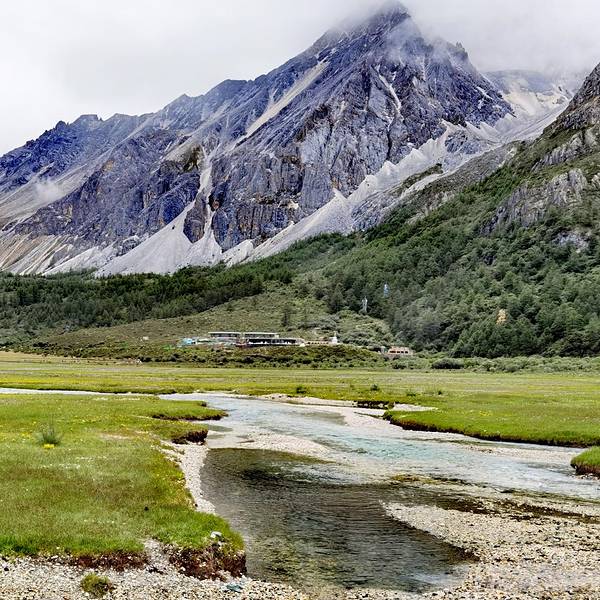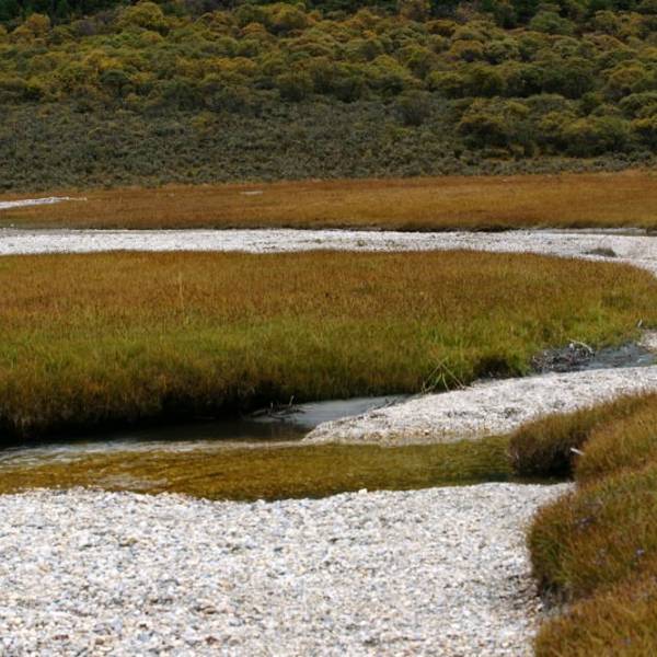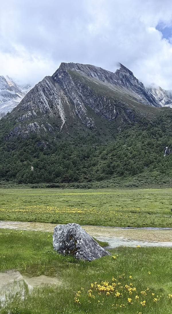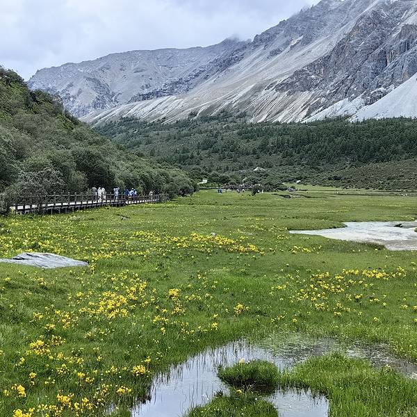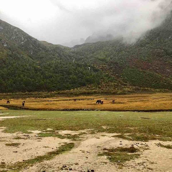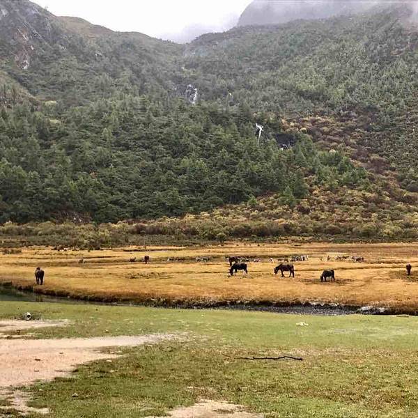 洛绒牛场海拔4150米,是一处高山牧场。牛场四周高山耸立,形成盆地。盆底便是一片高原草甸,风景极美。牧场东边是电瓶车终点站,西边是骑马站点。两边以栈道相接。我沿着栈道围绕牛场逆时针走了一圈。贡嘎河从牛场穿过,草甸里开着黄色的野花,林间溪水潺潺。3点多钟,马帮把几十匹马散放在草甸,让牛场更增添了诗情画意。