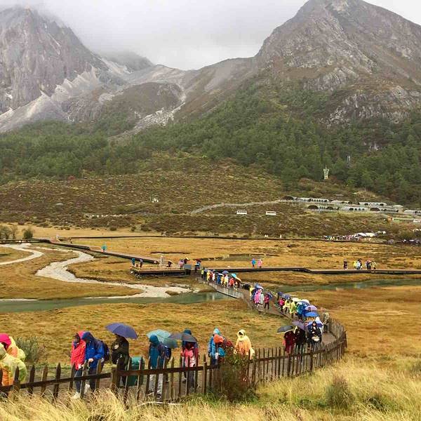 这个翡翠湖的倒影照犹如仙境一般。洛绒牛场的风景也是一绝。洛绒牛场这里一路是木栈道进入景区大门之后,坐上区间车上山,途中可以看见三大神山之首“仙乃日”。区间车的终点站是扎灌崩,下车步行500米到达冲古寺,以上这段路是所有人都一样的。从冲古寺开始,我们就分道扬镳。我们走长线的在冲古寺...进入景区大门之后,坐上区间车上山,途中可以看见三大神山之首“仙乃日”。区间车的终点站是扎灌崩,下车步行500米到达冲古寺,以上这段路是所有人都一样的。从冲古寺开始,我们就分道扬镳。我们走长线的在冲古寺要乘坐第二趟区间车(成人80,小孩50)前往洛绒牛场。(这段路有6、7公里,不坐车几乎不可能。)