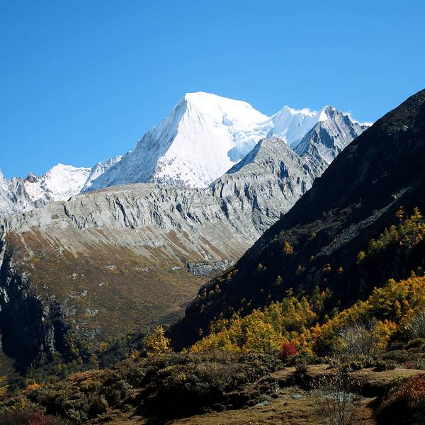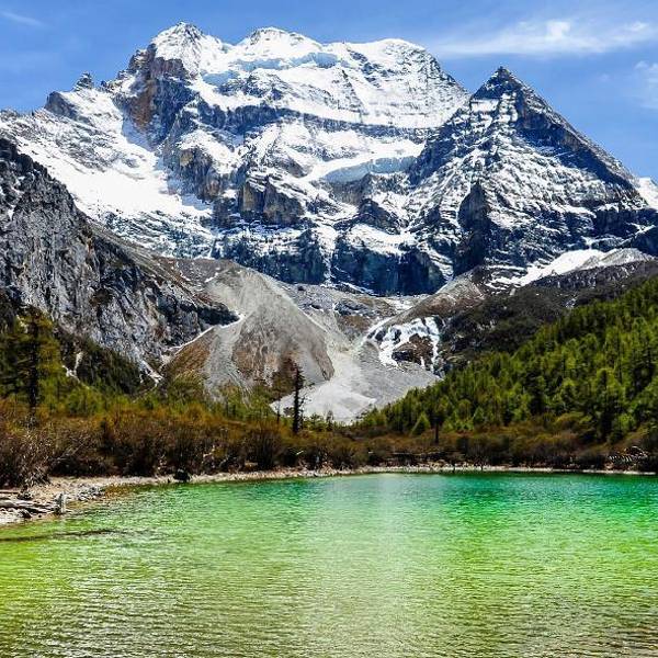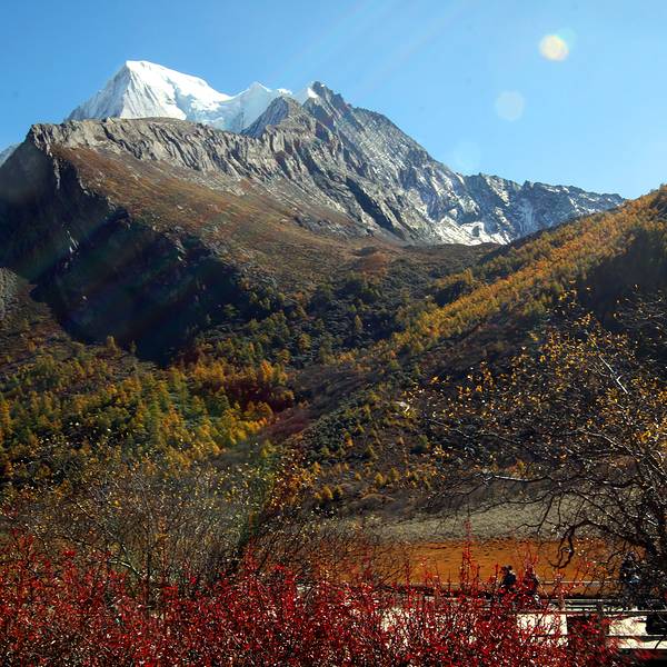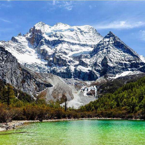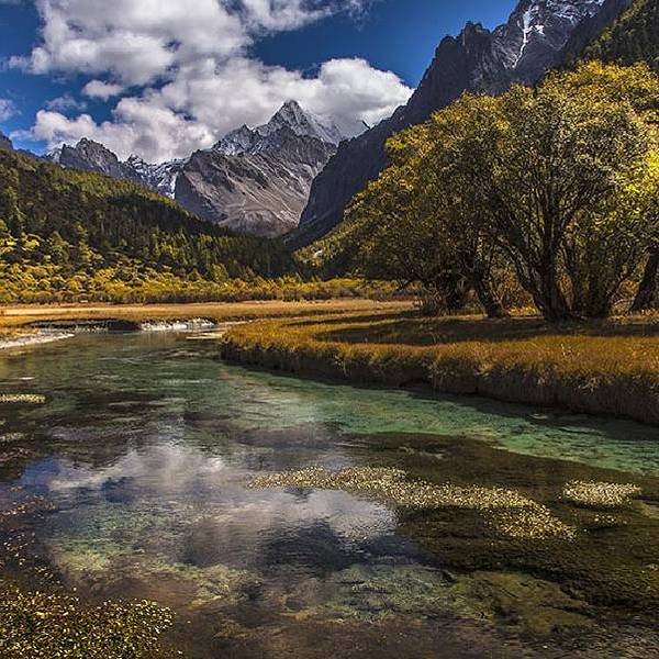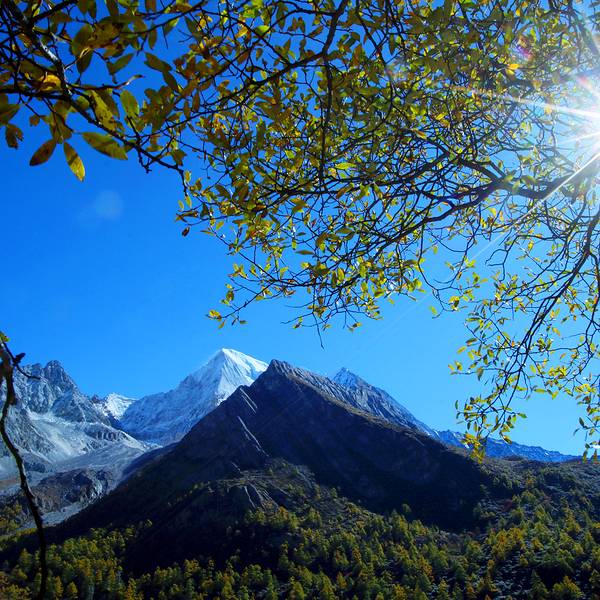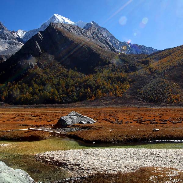洛绒牛场是欣赏夏诺多吉神山的最佳地点洛绒牛场是欣赏夏诺多吉神山的最佳地点。草木初黄,水清见底。阳光把树丛枝叶照得闪闪发亮蓝天下,山体甚是铮荣。