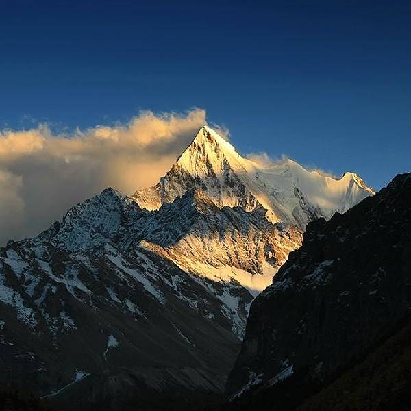 夏诺多吉意为“金刚手菩萨”,是“三怙主”雪山的东峰,雪山的主峰为三棱锥状,在3座雪山中造型最接...夏诺多吉意为“金刚手菩萨”,是“三怙主”雪山的东峰,雪山的主峰为三棱锥状,在3座雪山中造型最接近金字塔,沿雪山两翼锋利的刃脊蜿蜒绵亘,刃脊背向光线的一侧呈暗影。