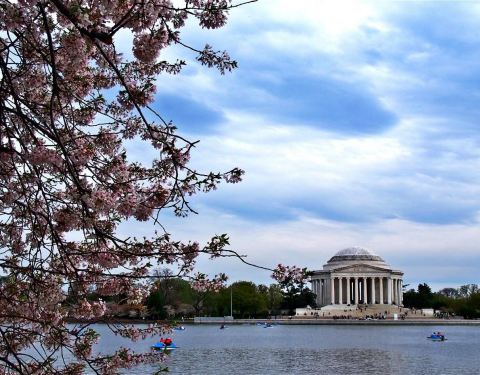 潮汐湖湖畔四周栽种了几千棵樱花树,每年4月竞相开放,缤纷绚烂,在杰斐逊纪念堂的映衬下,比日本的樱花更添一分宏大坚毅之美。北面是国家广场,可远远遥望到挺拔矗立的华盛顿纪念碑,西面有马丁·路德·金纪念碑和罗斯福纪念园,众殿环绕,别有一番景色。 1. 杰斐逊纪念堂 位于华盛顿潮汐湖旁边的杰斐逊纪念堂,是为了纪念托马斯·杰斐逊而建的,并按照杰斐逊喜爱的古罗马神殿式圆顶建筑风格设计,通体洁白,神圣而庄严。 2. 马丁·路德·金纪念碑 马丁·路德·金纪念碑是美国历史上第四个纪念个人的纪念碑,位于潮汐湖的西北方。马丁·路德·金因1963年在林肯纪念堂前发表《我有一个梦想》的演说而闻名世界。 3. 罗斯福纪念园 罗斯福纪念园位于潮汐湖的西岸,是为纪念罗斯福而建。此园不同于一般的纪念堂,错落有致的石墙成为主体,讲述罗斯福任职期间美国的重大历史事件。 4. 樱花烂漫的湖光美 在湖边可拍摄杰斐逊纪念堂的全景,也可以坐在纪念堂台阶上欣赏潮汐湖,眺望湖对岸的华盛顿纪念碑。彼时湖畔樱花盛开,配上湖中白色纪念堂的倒影,美不胜收。湖中也可泛舟,微风浮动落英缤纷,令人沉醉于此。