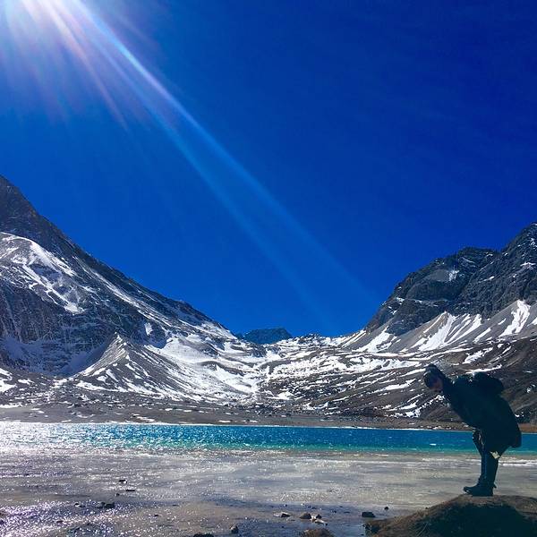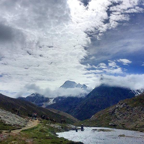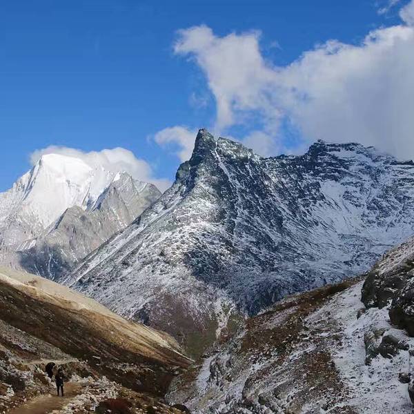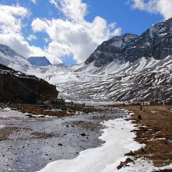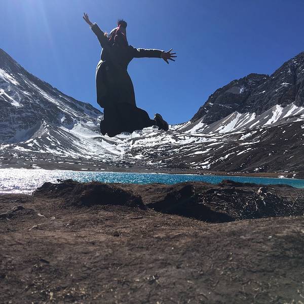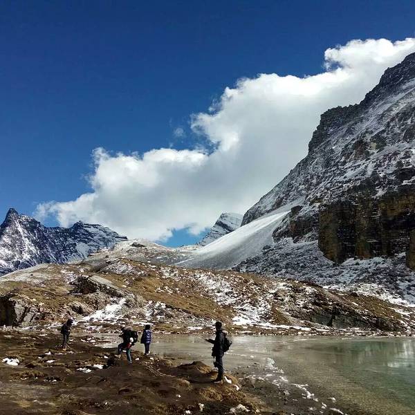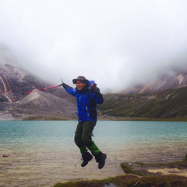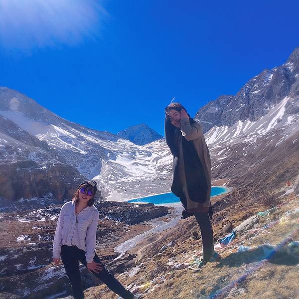 第一天爬珍珠海只是小试牛刀,在爬长线的时候早餐一定要补充好体力,青稞饼鸡蛋多吃一点。八点半的时候开始进入景区,前面一段和昨天到珍珠海是一样的,到了一个玛尼堆的地方,就可以看到去洛绒牛场的路,最好就是先坐电瓶车到洛绒牛场,电瓶车往返80元/人,不然就要纯徒步两三个小时左右才能到。如果需要骑马上去的一定要早点来,洛绒牛场每天只有30匹马,300元往返,据我观察时间差不多,而且有一段最难走的路也是要下马,只是骑马轻松点而已,相比之下,我更推荐纯徒步的爬山,这样可以更专注地欣赏沿途的景色,而且一脚一步地征服海拔的感觉,以后老了想起来都会笑吧。首先是一段石子路,并没有难度,后来才是走上坡路,并且有些水路需要小心点走。到了牛奶海,就可以拿出东西好好补充了!看着雪山环绕的牛奶海,自己在圣湖圣山面前是多么的渺小。我们迫不及待去五色海看看。