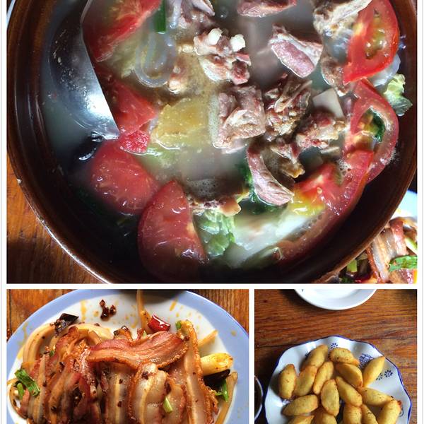 图上是腊排骨、纳西烤肉、土豆饺子,还要了酸梅汤,大家可以都尝尝,全是丽江的特色