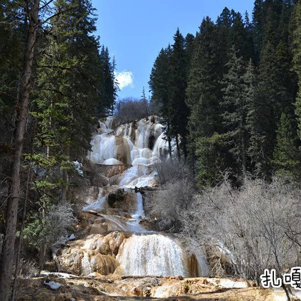 扎嘎瀑布是一座多层的叠瀑,叠叠多变。扎嘎瀑布高104米,宽35米,为中国最高的钙化瀑布。气势磅薄,涛声十里。
