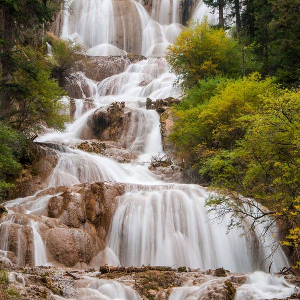 扎嘎瀑布位于扎嘎沟尾的扎嘎山下,扎嘎瀑布起点海拔3270米,落点海拔3176米,瀑高93.7米,瀑面宽35~40米,夏季流量2~5立方米/秒。为台阶式瀑布,夏季流量23立方米每秒。瀑布上游是湖泊,下游是阶梯式河床,湖水从巨大的钙化梯坎上飞速写速跌落,以每秒23米的流速经三级钙华台阶跌宕而下,冲击于巨大的钙华石壁,形成巨幅瀑身,声闻十里,如战鼓擂动,如万马奔腾。弥漫山谷的水雾饱和着高浓度的负氧离子,使人心清神怡。瀑布从海拨3270米高的钙化梯坎上汹涌咆哮着直倾而下,水势汹涌,涛声如雷,经三级土黄色的钙化台阶,跌宕起伏飞奔不停。每泄下一坎,便弹出一团团一簇簇晶亮透明的水花,如珍珠溅落,似孔雀开屏。水珠从梯坎上流下来,在阳光的照射下,流金溢彩,格外美丽。确有一种“飞流直下三千尺,疑是银河落九天”的壮观景象。经地质学家鉴定,扎嘎瀑布既为一液体瀑布又为一固体瀑布。所谓固体瀑布,指的是整个瀑面河床为一钙华体,钙华流尤如彩色液体飞流直下。钙华体上的水却清澈明亮。该瀑布为全国目前发现的落差最大的钙华瀑布,有“中华第一瀑”之美誉。