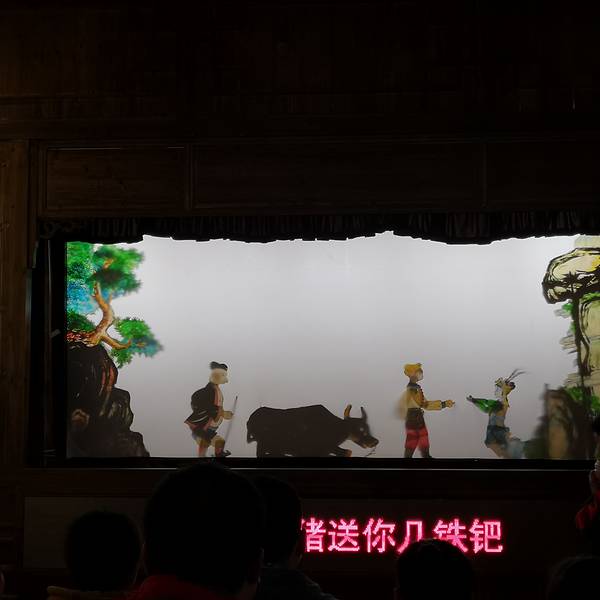 皮影戏馆翰林第景点的一个表演节目,分早场午场,午场13:00开始,提前就有游客坐等皮影戏馆翰林第景点的一个表演节目,分早场午场,午场13:00开始,提前就有游客坐等。前场后场都看到了,前面精巧活泼,后场其实是两个人拿着木偶在根据培养表演哩,动作很娴熟,所以才那么吸引人。