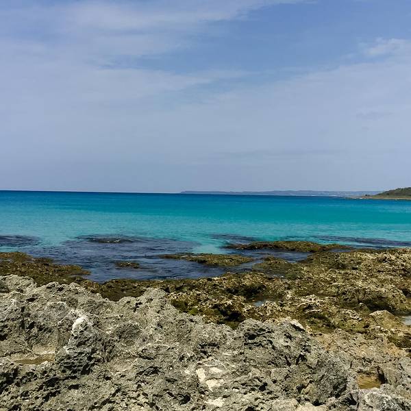 特别辽阔,外围有很大一片凹凸不平的珊瑚礁石,即使穿着鞋子有些也挺咯脚的,越靠近海水那边缝隙越大...路过【小湾浴场】还有【船帆石】,我们就到了风景如画的【第二站:砂岛】。