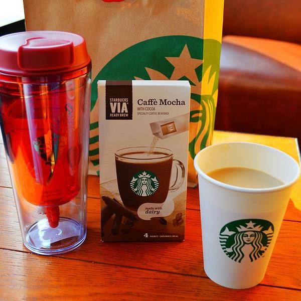 点了一杯最爱的焦糖,给自己买了一个礼包,一个羊年杯子,一盒咖啡