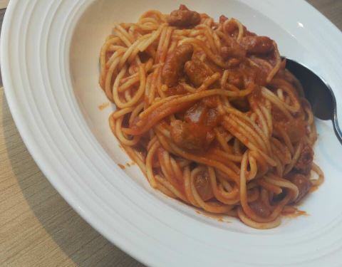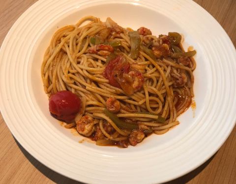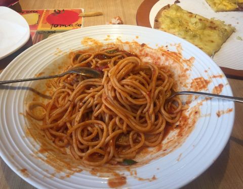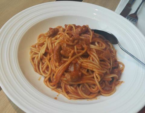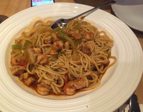 第二次过来吃,我点了小份麻辣小龙虾意面29元,味道还不错,就是没吃饱,孩子点了海鲜烩饭,也没见多少海鲜,小份南美肉香荟披萨还好吧!