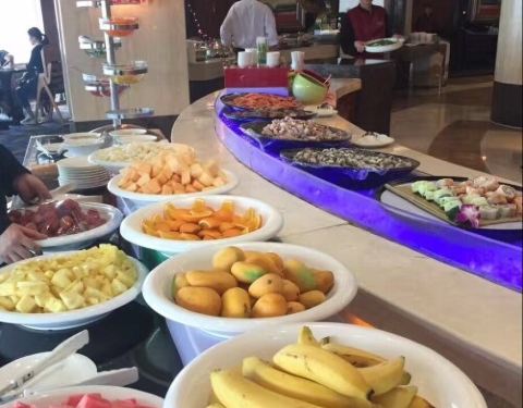 晚餐吃的东西多点,而且也鲜仙点。价格比中餐贵,海鲜很多,还有牛排等等还可以,不过一下子很难吃很多,基本上自助餐吃不了这么多。旋转餐厅转的比较慢,不过基本上都是在吃东西没留意外面风景了。