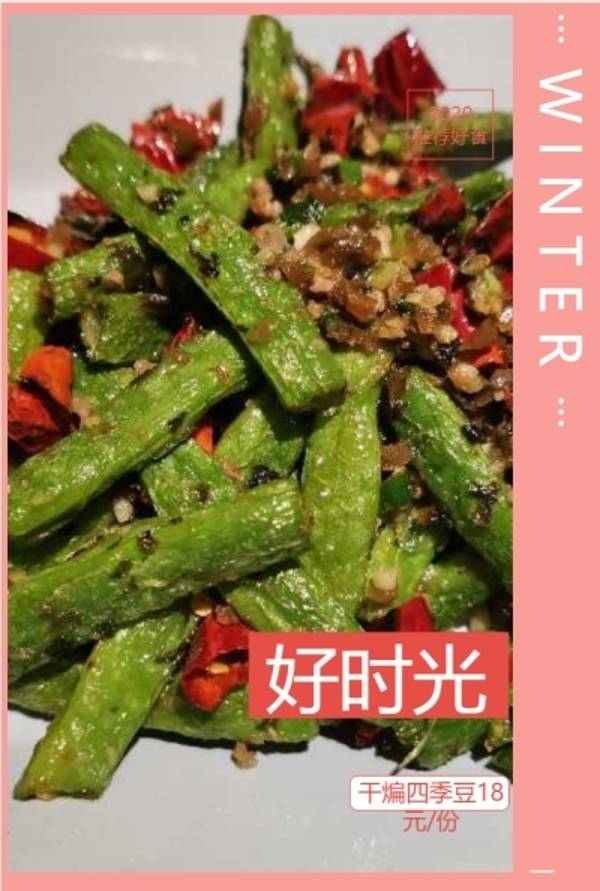 【干煸四季豆】加了辣椒干、蒜末干炒,外酥里嫩香气四溢的那种;