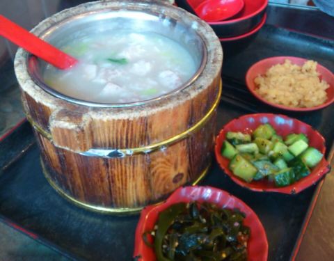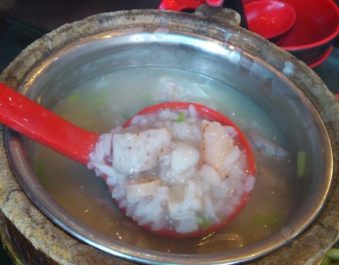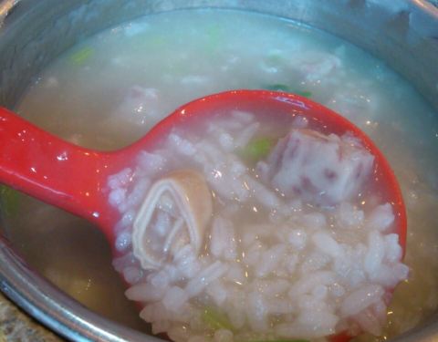 大清早的 这边生意不错诶 2个楼层 餐桌下还有贝克之类的装饰 选了【蠔干一品粥】¥46 套餐系列 送三小蝶副菜 海带丝、拌黄瓜、酱菜 想说 副菜真心一般 倒是粥品出乎意料的香、稠 首先米饭炖的绵绸 易吞咽 里面的食材很新鲜 有大肠、香芋块、 鱿鱼、干贝等海鲜 一直以来不爱大肠的我 也被这边的所折服 洗的非常干净 吃口很香诶 会不会从此以后 爱上大肠呢??? 套餐正好可以供2-3个女生享用 早餐和夜宵的好选择