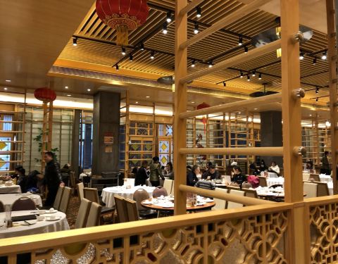 餐厅有4-5层楼的样子,一楼是接待大厅,有服务员专门指引,开发票也在一楼。三楼是散客区,4楼是婚宴,所以餐厅的容量非常大。普通消费者主要在三楼,餐厅面积接近上千平米,非常的奢华大气,座位主要是圆桌或卡座,非常的舒服。Tips: