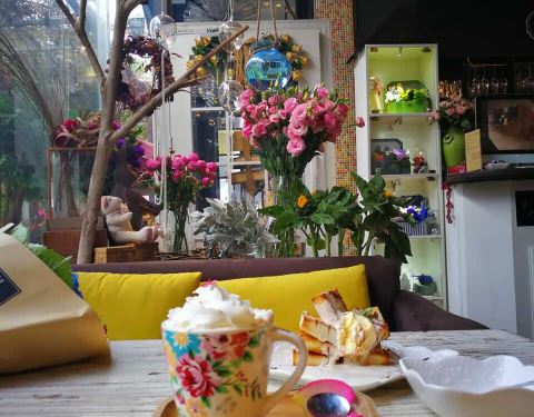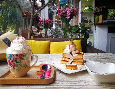 在芳香弥漫的鲜花中,享受初见咖啡的醇美。