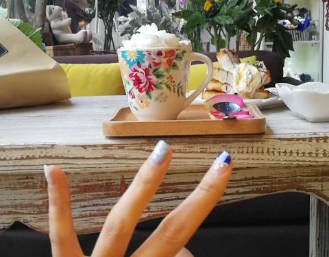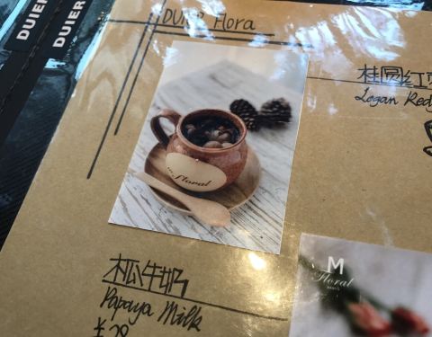 下午回到三亚市内,在酒吧街附近我们找了一家咖啡馆喝下午茶。这家咖啡馆叫“初见M-Floral”,店如其名,有一种安然若素的恬静。