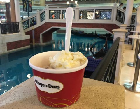 从龙环葡韵过天桥来到威尼斯人,真是又热又累,只想找个凉快的地方好好的休息一下。心里首先想到的就是哈根达斯或是星巴克,但诺大的威尼斯人酒店到哪去找这两个地方还真是难事,好在有电子地图,没费多少周折就...从龙环葡韵过天桥来到威尼斯人,真是又热又累,只想找个凉快的地方好好的休息一下。心里首先想到的就是哈根达斯或是星巴克,但诺大的威尼斯人酒店到哪去找这两个地方还真是难事,好在有电子地图,没费多少周折就找到了。但到了却有些傻,这家哈根达斯店小小的,只有3根高脚凳和一个小吧台,我们一行4人都坐不下!不过为了享受一下清凉,冰淇淋还是要吃的!
