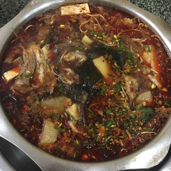 晚饭吃的羊肉汤锅,在大众上搜的,从酒店走路就可以过去,羊肉红汤锅是武隆的特色,真的是很好吃,量也很足,羊肉很多,没有膻味儿,里面还有羊杂,米豆腐,笨豆腐,萝卜,土豆,感觉萝卜特别好吃,吸收了烫的味道,吃完整个人都暖暖的,小料里的炸黄豆也很好吃,又辣又脆