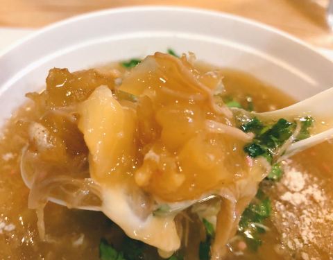 海味浓郁,贝类、鸡肉等非常嫩,富含胶质,很好喝。名字很有意思,叫“人比花娇翅”