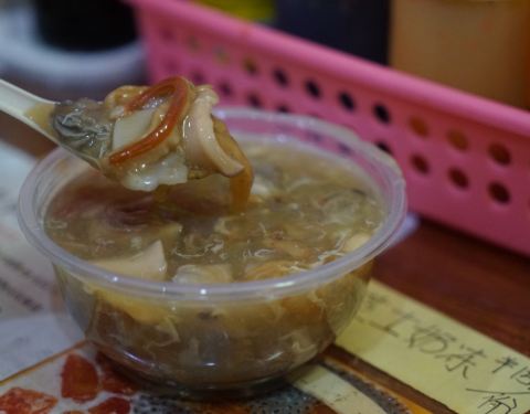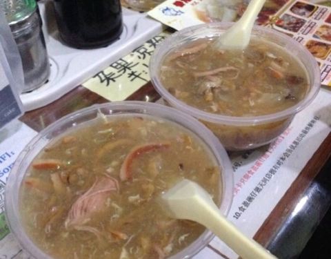 广州吃货之旅 做攻略的无意间搜到的小店铺,里面卖的碗仔翅是获过奖的,就抱着期待去了。其实很喜欢这种街边的小铺子,外表不起眼,其实卖的美食都有自己的特色。 这家店基本上都是外带,阿姨只收现金,收完钱,速度盛上一碗。阿姨说话又快又急,听不懂当地话的我真是干着急……肯定问了问题,也不爱搭理人…… ↘️人比花娇 点了料最多,价格最贵的人比花娇。食材有鱼翅,花胶,北极贝,海胆蓉。用料很实在,鲜美可口,吃起来清爽香甜。整体口感软糯黏稠,营养足足的,性价比还不错