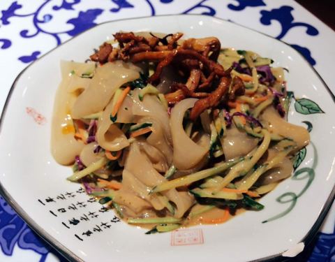 东北大拉皮上桌极富表演色彩,酱料调制得很独特,回味无穷。炒合菜卷春饼是店里必点的菜