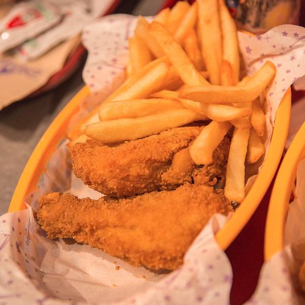 香港迪斯尼里面性价比最高的餐厅了,价格比较适中,一个篮子鸡块100港币,还是可以接受的,有三块鸡一杯饮料还有一点点薯条,鸡肉皮很香,肉很嫩。
