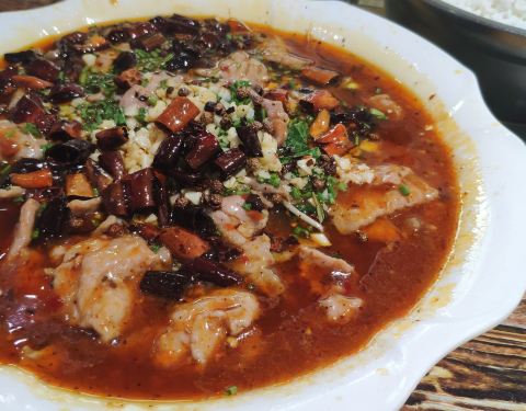 这两天的宜宾实在是太热,想在住处附近随便找个馆子。下来看到这家最近,于是就进去点了几个菜。馆子不大不小,看上去很普通。虽然开了空调,但是不怎么管用,坐着吃饭都在飙汗。回锅肉一般,火候不够。水煮肉片...